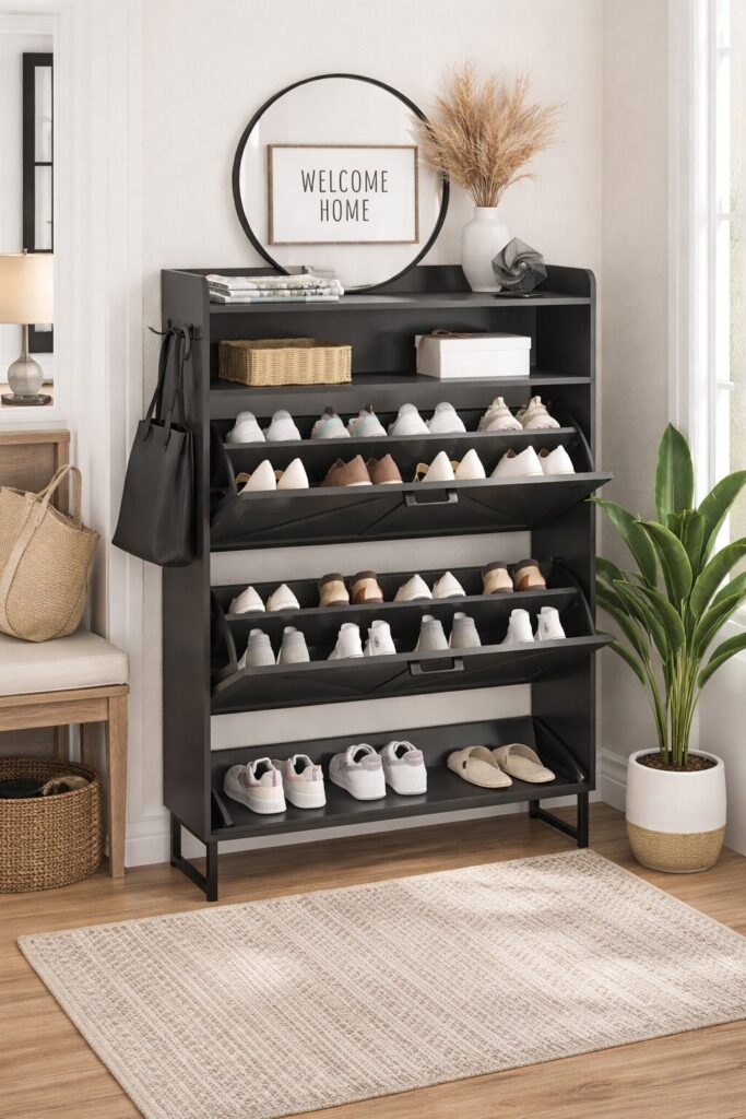 Slim shoe cabinets are one of the easiest ways to store multiple pairs without sacrificing valuable floor space. These cabinets sit close to the wall and often tilt outward to hold shoes vertically.