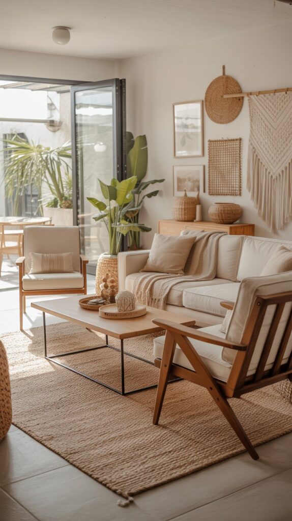 Start with a clean white wall and layer in rattan textures, soft pillows, and earthy neutrals. Add a patterned area rug and dried pampas grass for a touch of boho charm. A curved cane accent chair with cream cushions becomes the star of the room.