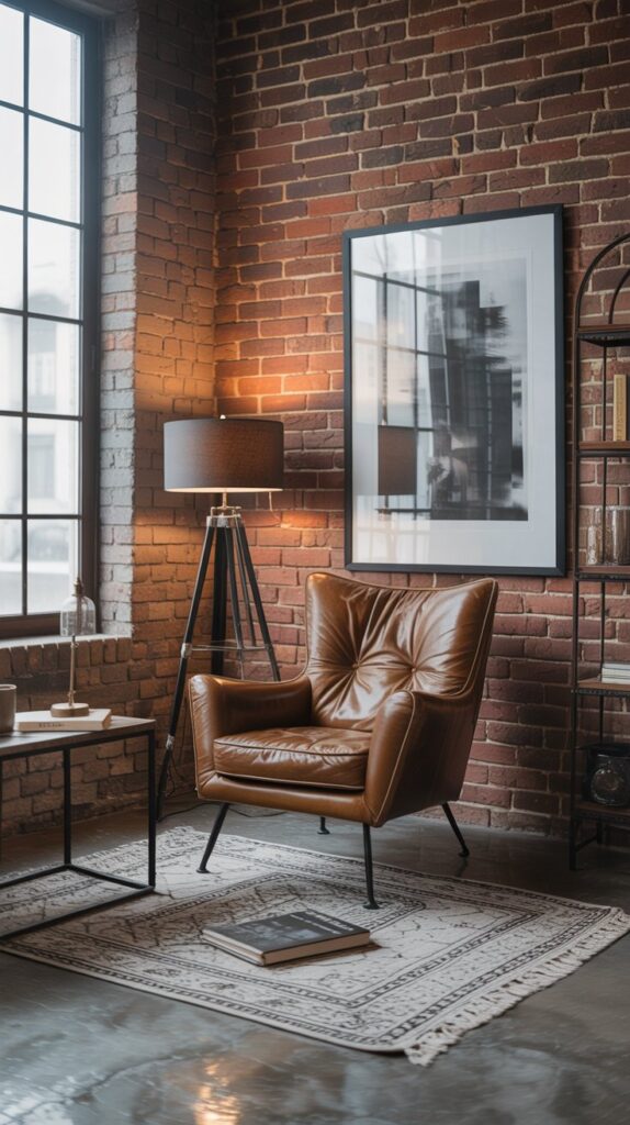 Think dark walls, metal finishes, and rich textures. An aged leather armchair with black iron legs fits right into an industrial-style space. Add a vintage floor lamp, exposed brick, and black-and-white art for a stylish city vibe.
