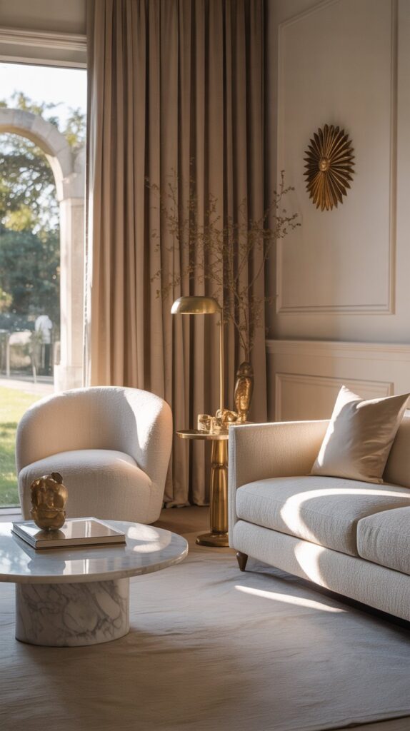 In a room full of soft whites and light taupes, an upholstered accent chair in beige or linen adds timeless elegance. Include touches of brass, soft velvet curtains, and a sculpted coffee table to keep things sophisticated.