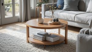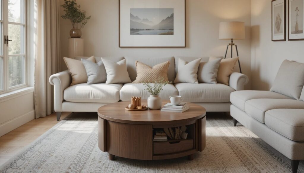 Round coffee tables with concealed compartments are ideal for small living rooms where clutter builds up fast. Their smooth edges improve flow in tight spaces while keeping everyday items tucked neatly out of sight.