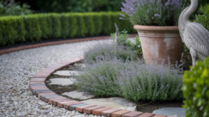- Use cobblestone or brick borders to enhance round beds and paths.