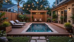 Create a low, floating deck alongside a small in-ground pool. This setup keeps the look sleek and modern without taking up vertical space. It’s perfect for minimalist designs that highlight wood, water, and clean lines.